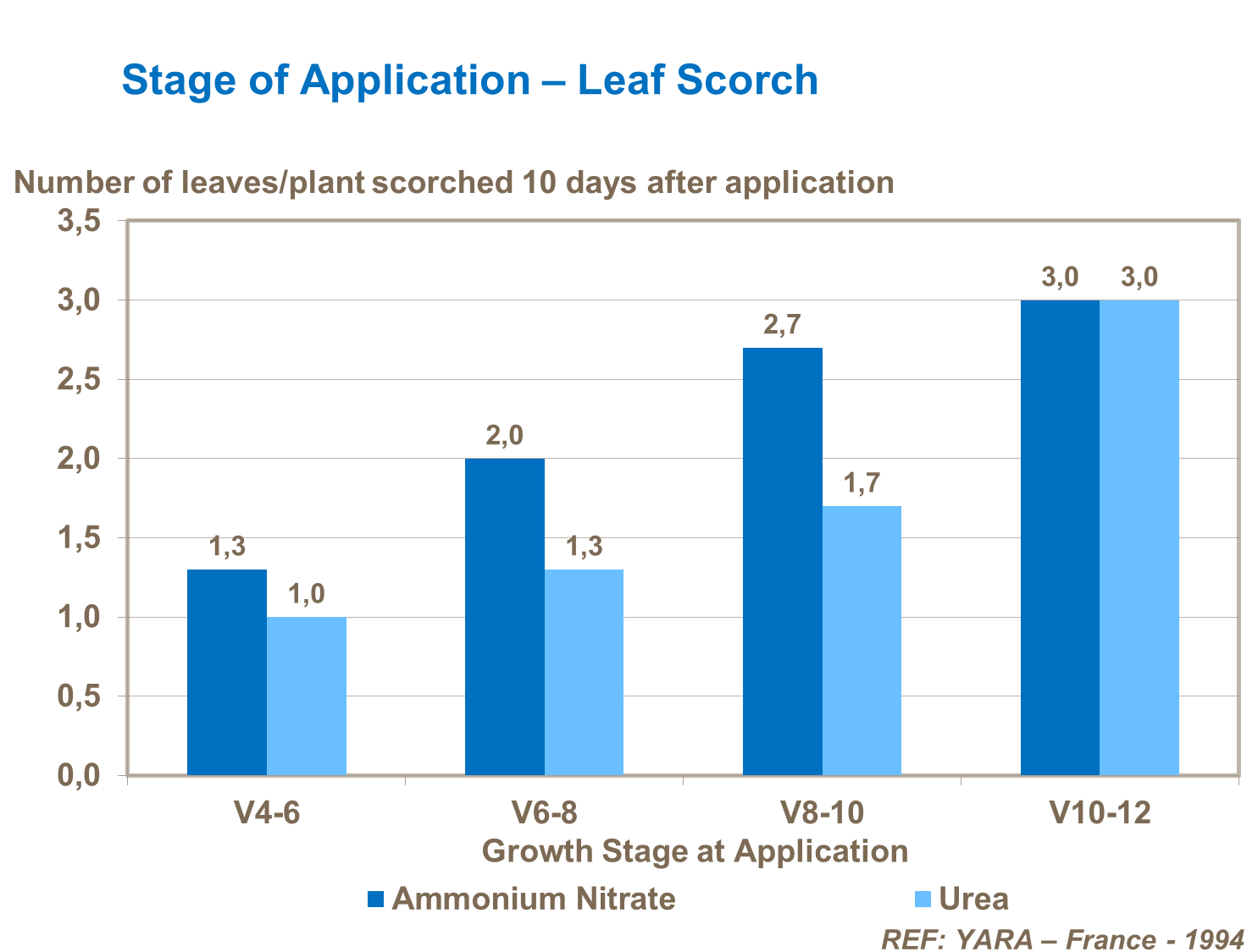 While the effects of this scorching rarely adversely affects yield as a result of plant recovery and regrowth, French research shows that broadcasting is best carried out prior to the V6 stage.