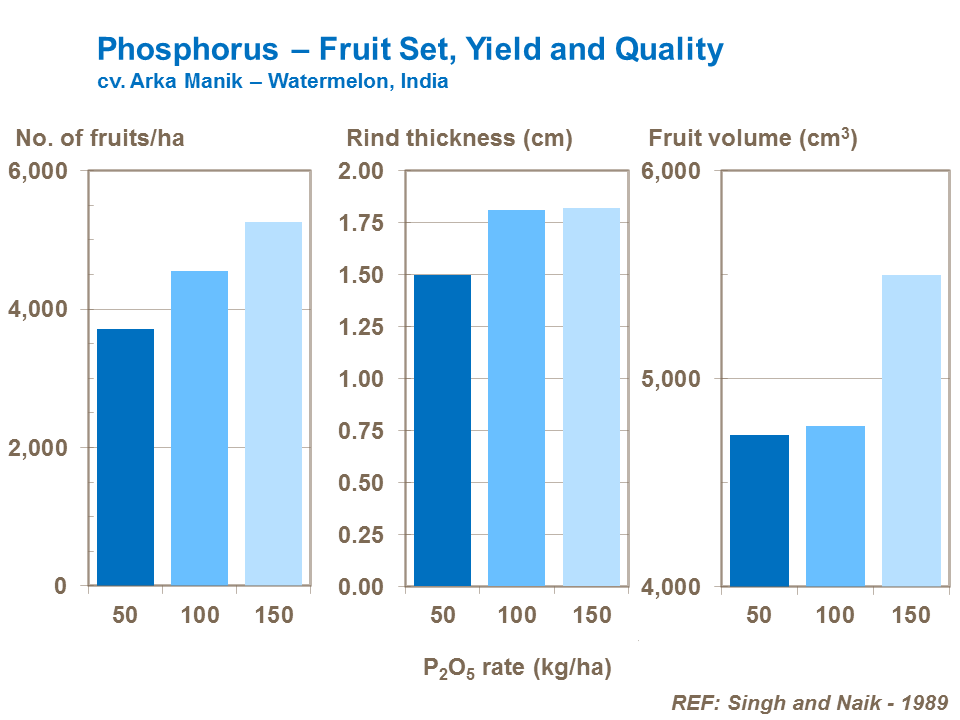 Phosphorus is generally applied early and up to fruit set, ensuring supplies are not limiting. Phosphorus is readily redistributed throughout the melon plant. It is particularly important to have adequate phosphorus prior to flowering as it increases melon fruit set and weight, encouraging higher yields and producing thicker skins. Deficiencies can result in flower abortion.