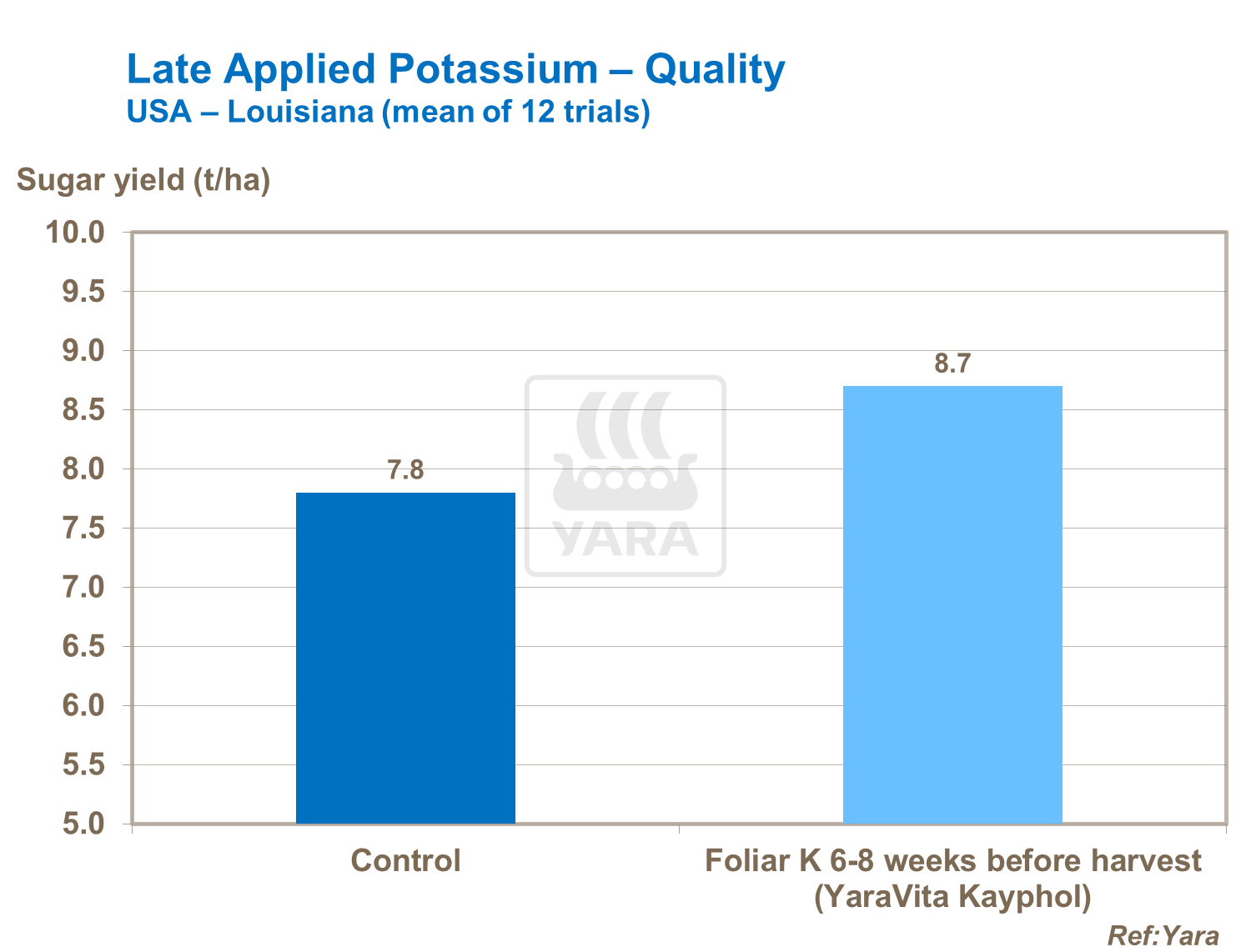 Sugar is also influenced by magnesium supply and sucrose content is reduced where magnesium nutrition is inadequate. It is important to balance the levels of potassium and magnesium, as high levels of potassium can restrict and compete with uptake of magnesium.